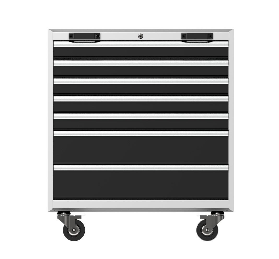 Værktøjsskab med robust konstruktion og indvendig ramme. 7 skuffer med plads til hver 4 værktøjssæt, som kan trækkes helt ud og er udstyret med robuste kugleskinner. Alle skuffer har også en transportlås, når de er lukket, så skabet kan flyttes, uden at skufferne kører ud. Store, drejelige hjul (TPR), to med bremser, 127 x 50 mm. Kraftig gummimåtte på bordpladen og tyndere måtter i alle skuffer. Alle skuffer er udholdenhedstestede til 50.000 cyklusser med en belastning på 45 kg. Vognen er udholdenhedstestet med en belastning på 300 kg på en rystetransportør over 20 km.