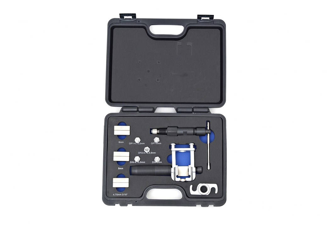 Hydraulic tool for flaring brake pipes directly on vehicle. For SAE or DIN, single or double flaring. Complete with tools, punch, and jaws for copper pipes 4.75, 5, 6 mm.