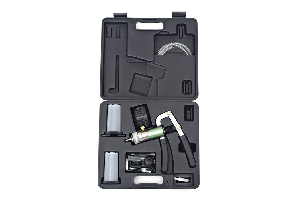 Complete set with hand pump (vacuum and pressure) and adapters for easy problem-solving in many different systems, such as fuel system, carburettor, fuel pressure regulator, brake servo, etc. Can also be used with advantage for brake bleeding and removal of fluids by suction.