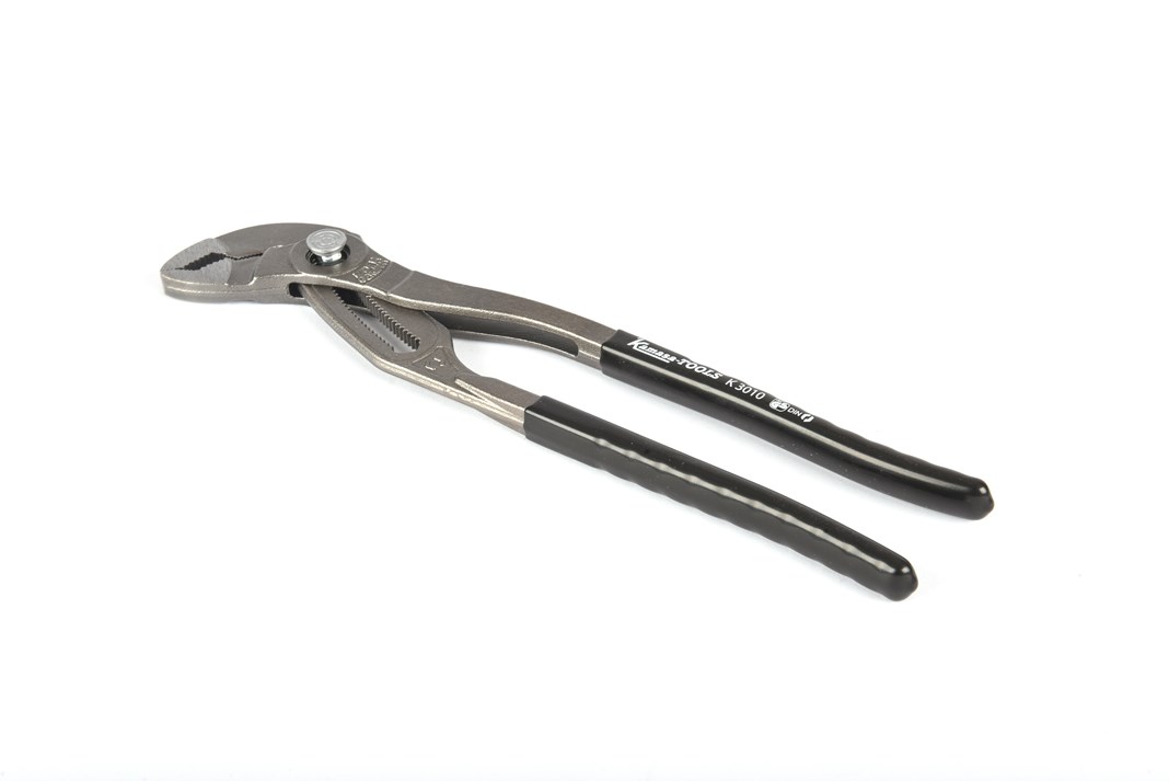 Adjustable Water pump pliers forged from high-quality chrome vanadium steel. Vinyl-dipped handles for better maneuverability. Quick adjustment with a push button to prevent accidental adjustment of the grip width. Delivered packaged on a hanger.