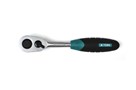 Close-step mechanism, 64 teeth, requires only 6º of movement. Recessed quick-release button for the socket, chromed and reversible.