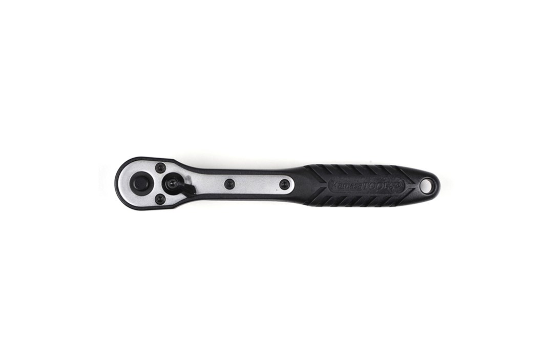 Ratchet mechanism with 45 teeth requires only 8° movement. Impact-resistant, oil and cold-resistant handle with integrated steel shaft reinforcement. Quick-release button. Reversible.
