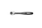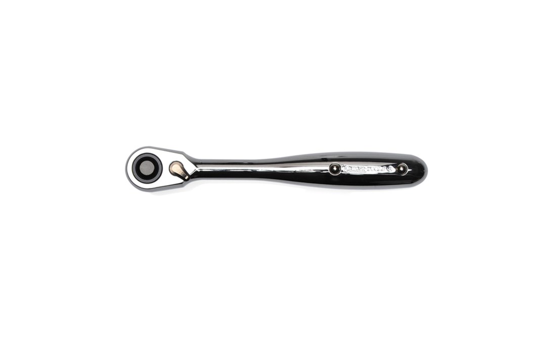 Compact ratchet head with quick-release button. Extra heavy-duty 72-teeth, reversible lock mechanism requires only 5º of movement. Bright chrome vanadium body with rubber for better grip.