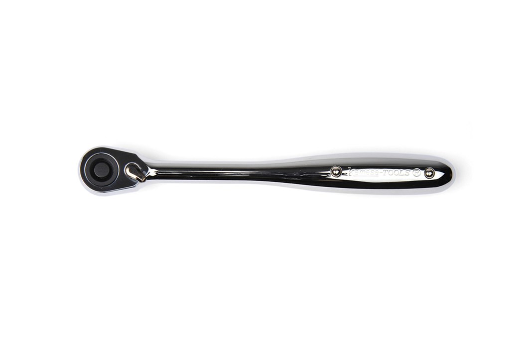 Compact ratchet head with quick-release button. Extra heavy-duty 72-teeth, reversible lock mechanism requires only 5º of movement. Bright chrome vanadium body with rubber for better grip.
