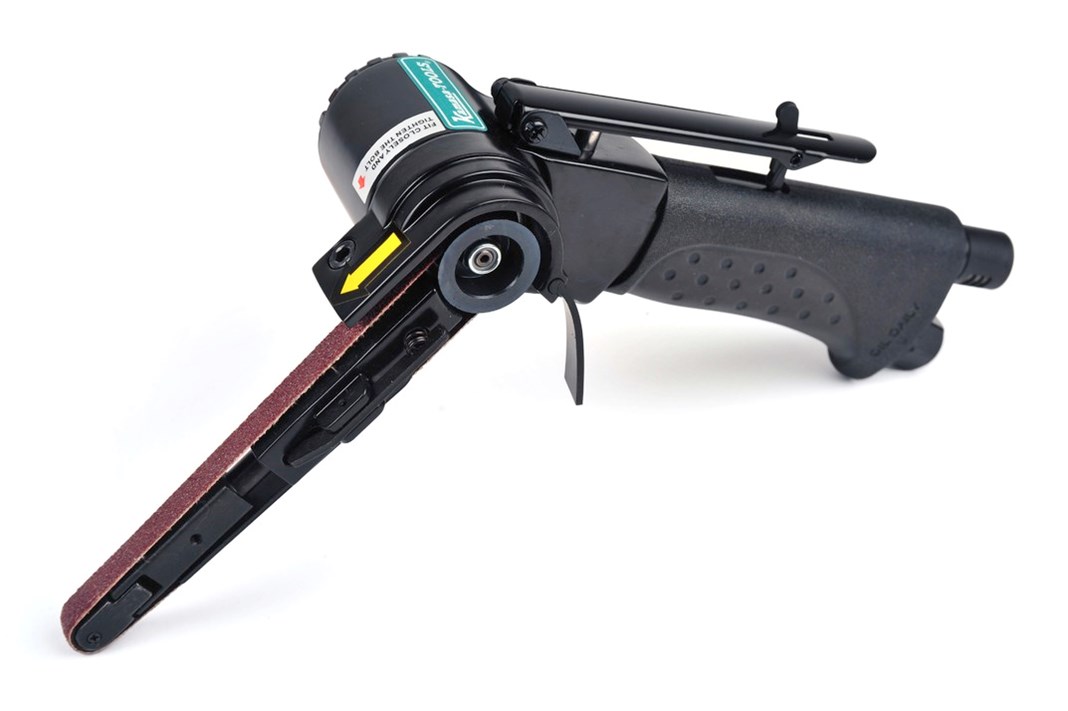 Belt sander for 10 mm grinding belts. Effective damping of motor noise and 360 degree rotating air connection. Aluminum chassis equipped with rubberized grip and throttle control with safety lock.